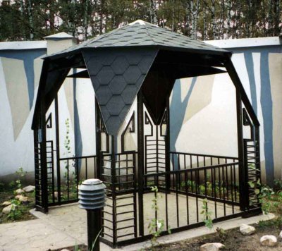 Конструкция металлической беседки должна быть очень надежна и функциональна. После изготовления происходит обезжиривание беседки, обработка труднодоступных мест и покрытие грунтом (для некоторых видов красок покрытие грунтом не требуется), покраску беседки можно произвести разными видами лакокрасочного покрытия.